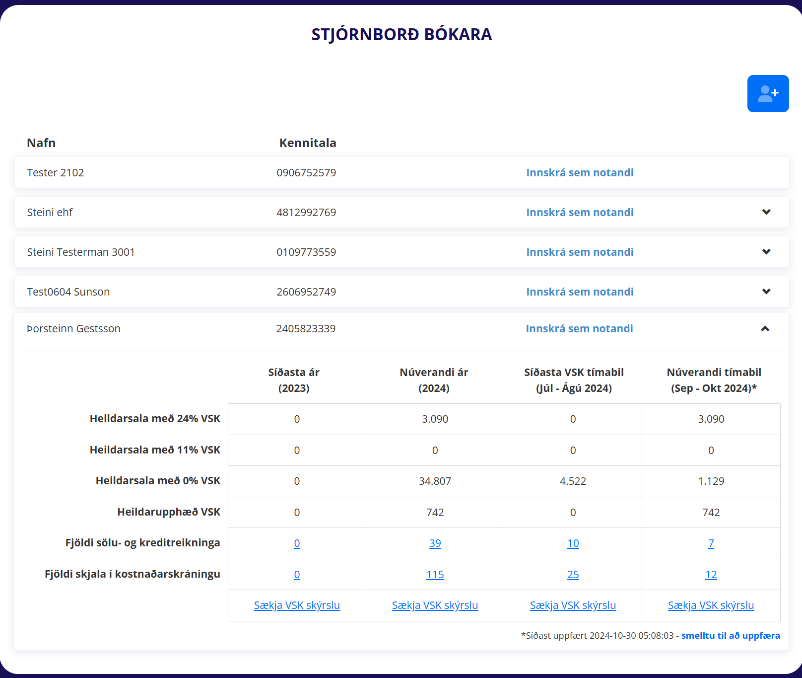 Bókarar geta einnig skoðað lykiltölur um viðskiptavin, sótt VSK skýrslu eða kostnaðarreikninga beint úr stjórnborðinu. Þeir valmöguleikar birtast ef smellt er á píluna lengst til hægri í hverri línu.